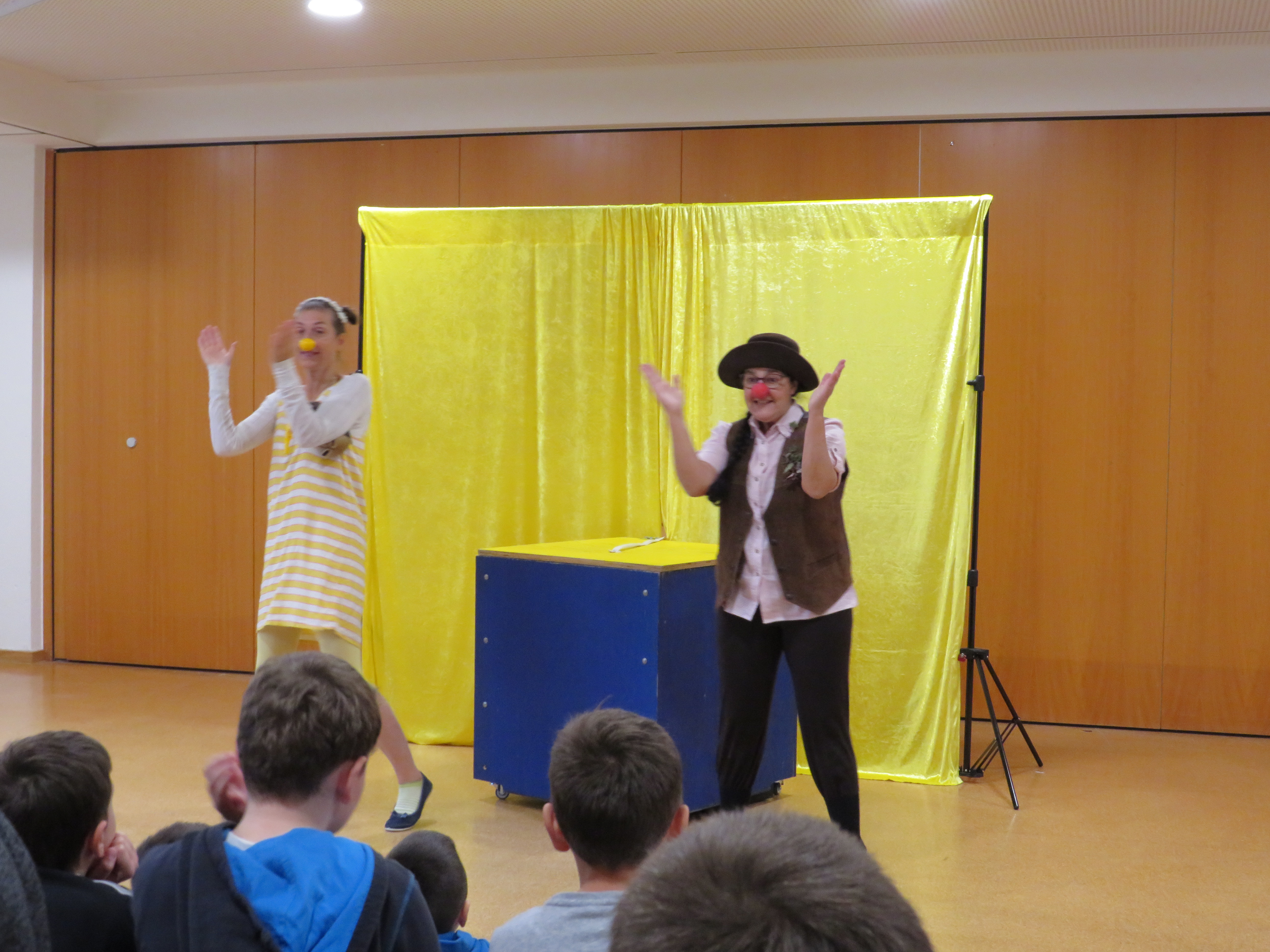 Als sich der Vorhang in der voll besetzten Aula öffnete und den Blick auf eine richtige Theaterbühne mit Lichteffekten, Mikrofonen, Wechselkulissen, Vorhänge auftat, war klar: der Anspruch an die Vorführungen ist groß, die Erwartungen auch – beides wurde voll und ganz erfüllt. Einmal waren es die selbst hergestellten Kostüme, Verkleidungen, Requisiten, die das Spiel ausschmückten und lebendig erscheinen ließen. Ein anderes Mal begleiteten Lieder und rhythmisch-musikalische Elemente die schauspielerischen Darbietungen und sorgten für bunte und unterhaltsame Abwechslung. Nicht zuletzt war das erfolgreiche Bemühen aller Schülerinnen und Schüler um eine schauspieltaugliche Sprache - mit Anstrengung und Ernsthaftigkeit vorgetragen – nicht zu übersehen. Und schließlich die große Spannweite zwischen Klassen 1 und 6, bei deren Auftritten die Zuschauer spürten, dass die Inhalte der Stücke genau auf die Altersstufe angepasst wurden.